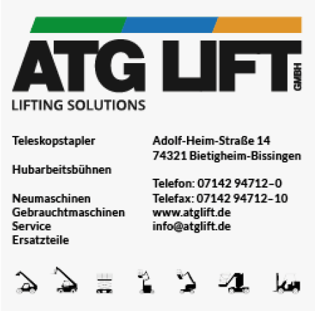 ATG LIFT GmbH Lifting Solutions Adolf-Heim-Str. 14 · Bietigheim-Bissingen · Tel. (07142) 94712-0 Internet: www.atglift.de E-Mail: info@atglift.deBranchen: Teleskopstapler, Scherenbühnen, Hubarbeitsbühnen, Hubarbeitsbühnen/Verkauf, Baumaschinen-Verkauf, Baumaschinen und -geräte, Arbeitsbühnen/Verkauf, Arbeitsbühnen, Teleskopstapler/Verkauf |