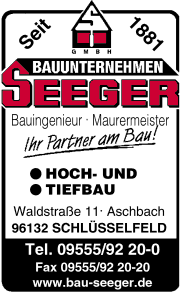 | Bamberg |    | Seeger Bau GmbH Waldstr. 11 · 96047 Schlüsselfeld-Aschbach Telefon (09555) 9220-0 · Telefax (09555) 9220-20 Internet: www.bau-seeger.de E-Mail: info@bau-seeger.deBranchen: Erdarbeiten, Bauunternehmen |