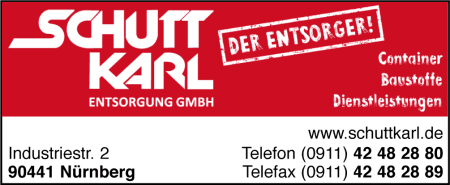 Schutt Karl Entsorgung GmbH Industriestr. 2 · Nürnberg · Tel. (0911 ) 42482880 Internet: www.schuttkarl.de E-Mail: info@schuttkarl.deBranchen: Entsorgung, Containerdienst, Container, Bauschuttabfuhr, Mulden, Schuttabfuhr |