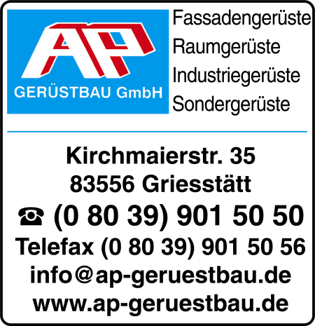 AP Gerüstbau GmbH Kirchmaierstr. 35 · Griesstätt · Tel. (08039) 9015050 Internet: www.ap-geruestbau.de E-Mail: info@ap-geruestbau.deBranchen: Sondergerüste, Raumgerüste, Industriegerüste, Gerüstbau u. -verleih, Fassadengerüste, Wetterschutzdächer |