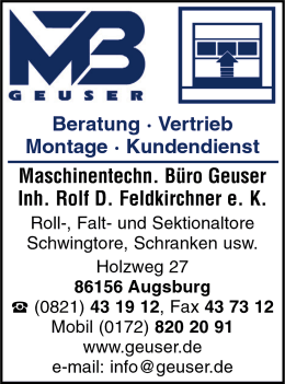 MTB Geuser, Inh. Rolf Feldkirchner e. K. Holzweg 27 · Augsburg · Tel. (0821 ) 431912 Internet: www.geuser.de E-Mail: info@geuser.deBranchen: Torsysteme, Tore und Türen, Torantriebe, Toranlagen, Sektionaltore, Industrietore |